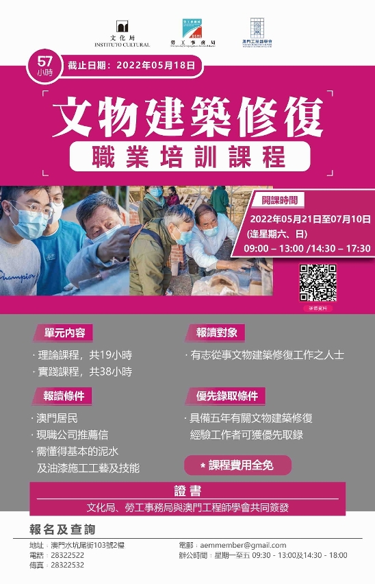 为持续培养澳门本地文物建筑修复人才,文化局、劳工事务局与澳门工程师学会将合办“文物建筑修复职业培训课程”,并于5月21日至7月10日期间举行,费用全免,完成课程并通过考核之学员将获发课程证书,欢迎现正从事或有兴趣从事文物建筑修复工作的澳门居民报读。