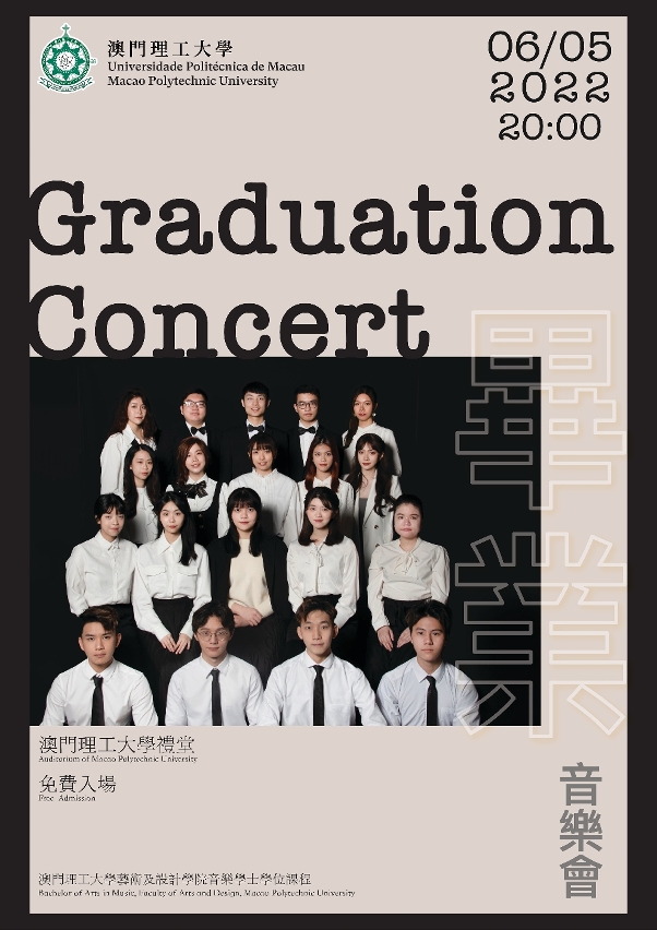 澳门理工大学艺术及设计学院“毕业独奏音乐会”和“班级毕业音乐会”,对外开放,免费入场。为配合澳门特区政府卫生局防疫指引,入场人士必须佩戴口罩、接受体温探测,并扫描行程记录的场所二维码(简称场所码)及出示当天有效的个人健康码。欢迎有兴趣人士前来欣赏音乐学子的精彩呈献,详请可致电85993243查询。