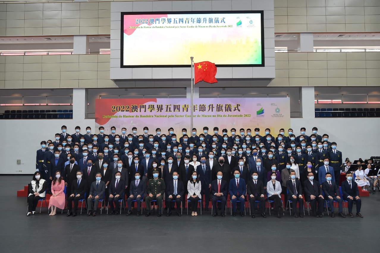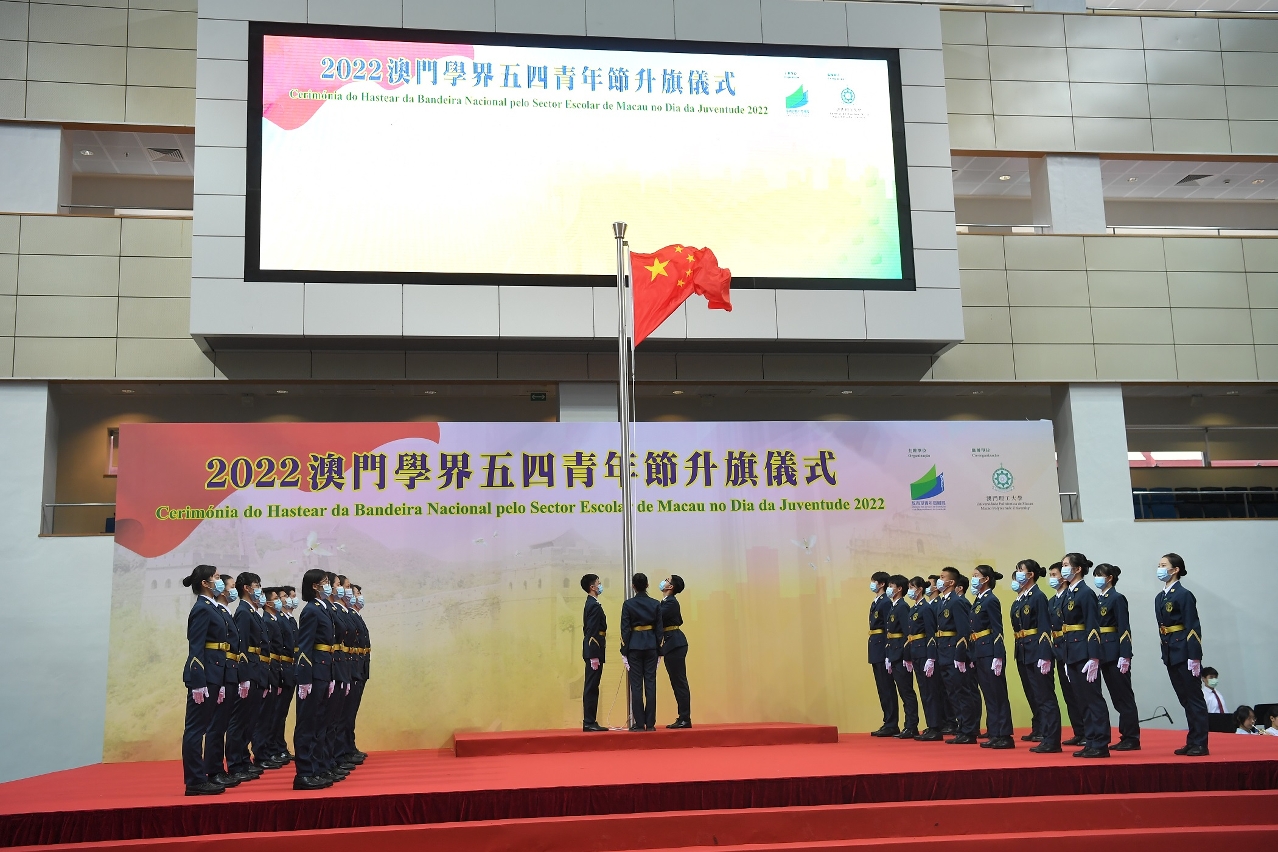 “澳门学界五四青年节升旗仪式”于2022年5月4日早上7时45分在澳门理工大学体育馆举行。在澳门青年管乐团现场奏乐下,澳门学界升旗队队员随着音乐步操向升旗台,并在中华人民共和国国歌奏起时庄严地升起国旗。同时,在圣家学校、鲍思高粤华小学、嘉诺撒圣心英文中学、圣公会(澳门)蔡高中学、澳门浸信中学及中葡职业技术学校6所学校合唱团的带领下,场内众人高唱国歌,场馆响彻嘹亮的歌声,洋溢高涨的爱国之情。
