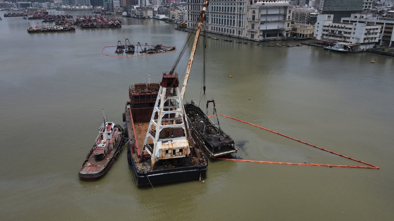 早前内港的渔船火警六艘涉事渔船中,一艘渔船由海事局救援船拖回岸边,有一艘渔船随水漂流至内港客运码头对开的一段内港航道并下沉,另有四艘相连渔船在内港锚地下沉。海事局全力协助下沉渔船的打捞和善后工作,安排打捞船队到现场进行评估及拟定计划,并于今日早上开始打捞作业。