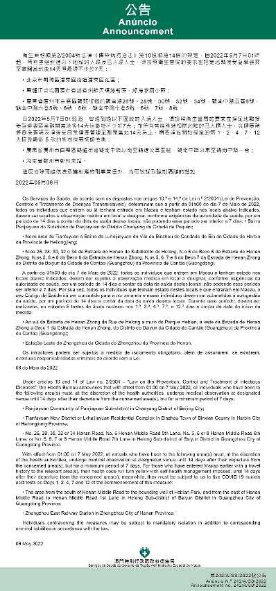 新型冠状病毒感染应变协调中心(下称应变协调中心)宣布,因应内地的疫情变化,卫生局根据第2/2004号法律《传染病防治法》第10条和第14条的规定,自2022年5月7日凌晨1时起,所有曾经到过以下地点的入境及已入境人士,须按照卫生当局的要求在指定地点接受医学观察至离开当地后14天但最短不少于7天: