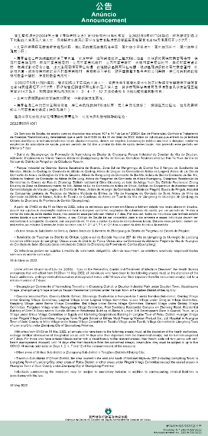 新型冠状病毒感染应变协调中心(下称应变协调中心)宣布,因应内地的疫情变化,卫生局根据第2/2004号法律《传染病防治法》第10条和第14条的规定,自2022年5月11日凌晨1时起,所有曾经到过以下地点的入境及已入境人士,须按照卫生当局的要求在指定地点接受医学观察至离开当地后14天但最短不少于7天: