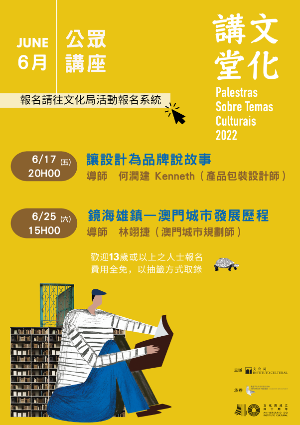 由文化局主办的艺术普及计划《文化讲堂》致力以互动及小班制的形式积极在校园与社区进行文化教育推广,6月将推出两场公众场讲座,包括《让设计为品牌说故事》与《镜海雄镇—澳门城市发展历程》,讲座均以粤语进行,市民可于5月16日(星期一)上午10时起于文化局网页“活动报名系统”报名,费用全免。