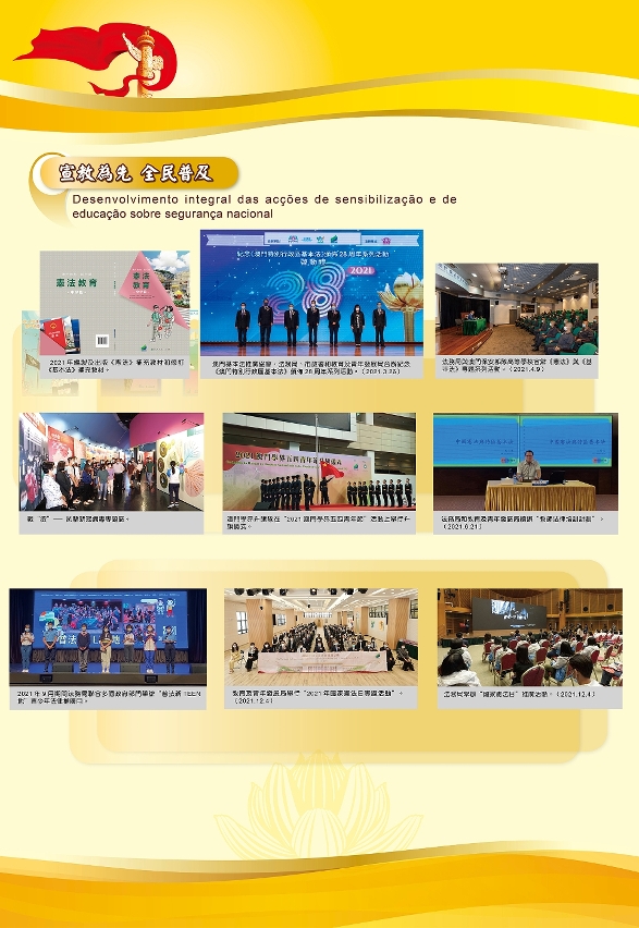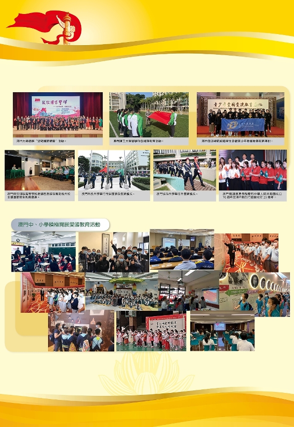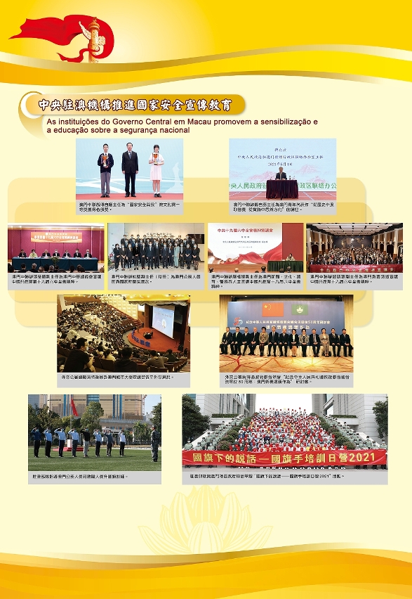 当中,为庆祝中国共产党百年华诞,特区政府与中联办隆重举办大型图片展,获得了社会各界和广大市民踊跃参与,超过43,000人次到场观展。中央驻澳机构持续推进国家安全宣传教育,举办了一系列形式多样的爱国教育活动。驻澳中资企业在积极保障澳门民生经济的同时,亦开展了多种宣传教育活动,而国家奥运精英运动员代表团访澳,与市民近距离接触,分享夺冠的喜悦,加深了广大市民的国家荣誉感和自豪感。