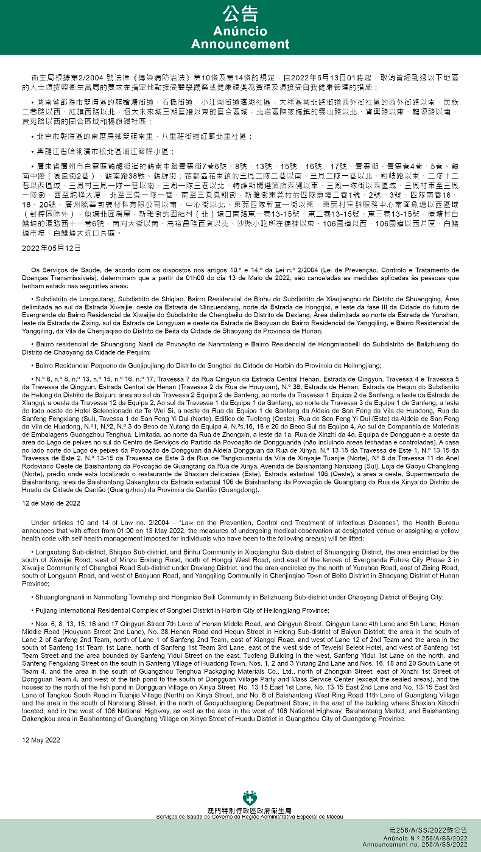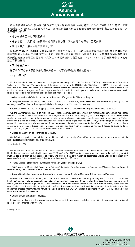 新型冠状病毒感染应变协调中心(下称应变协调中心)宣布,因应内地的疫情变化,卫生局根据第2/2004号法律《传染病防治法》第10条和第14条的规定,自2022年5月13日凌晨1时起,所有曾经到过以下地点的入境及已入境人士,须按照卫生当局的要求在指定地点接受医学观察至离开当地后14天但最短不少于7天: