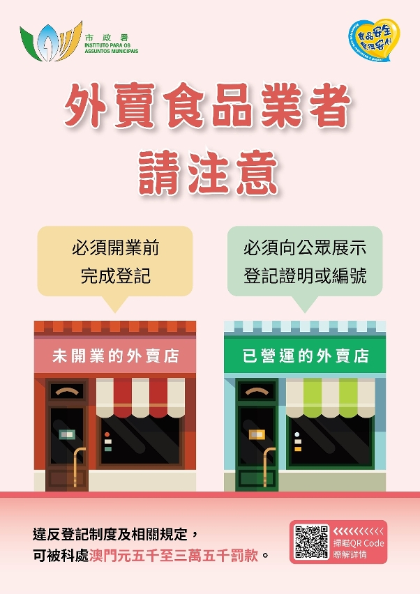 第30/2021号行政法规《外卖食品活动场所的登记制度》于去年十一月十五日起生效。市政署提醒所有正在本澳经营的外卖食品场所均须完成登记并领有证明,业界务必严格按照登记制度生产经营,尤其注意必须向公众展示登记资料;而消费者亦应光顾依法展示登记资料的外卖店,确保店铺受市政署监管,为自身食用安全把关。