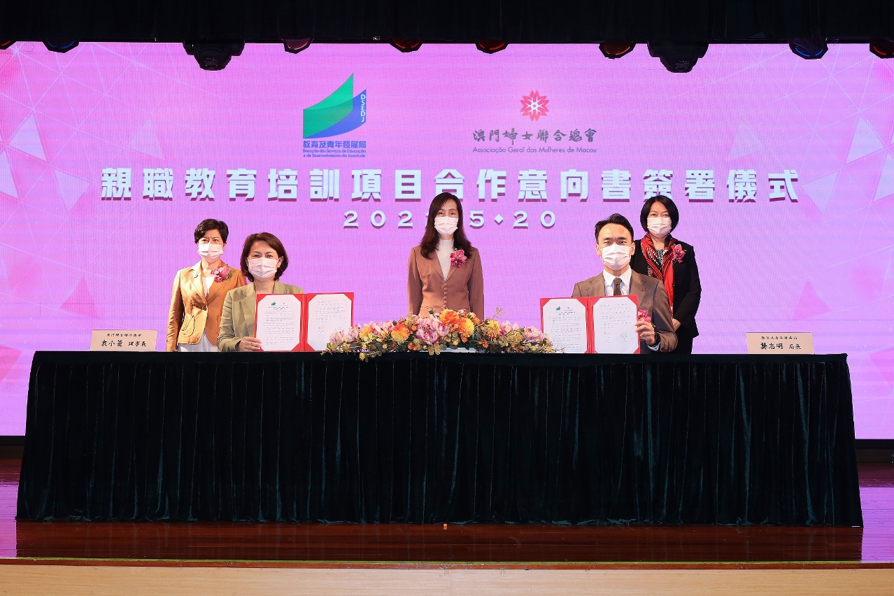 为推动亲职教育,扩大亲职教育的支援网络并与社区联动协作,为家长提供多元化亲职教育培训和亲子活动,教育及青年发展局与澳门妇女联合总会于2022年5月20日签订“亲职教育培训项目”合作意向书。在社会文化司司长欧阳瑜、中央人民政府驻澳门特别行政区联络办公室副主任严植婵、妇联会长刘金玲的见证下,由教青局局长龚志明与妇联理事长袁小菱签署意向书。