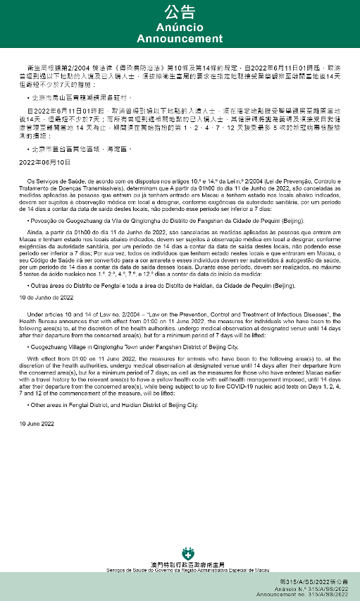 自2022年6月11日凌晨1时起,取消曾经到过以下地点的入境及已入境人士,须按照卫生当局的要求在指定地点接受医学观察至离开当地后14天但最短不少于7天的措施:北京市房山区青龙湖镇果各庄村。