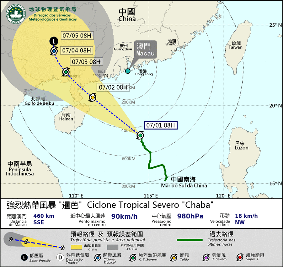 强烈热带风暴「暹芭」将向西北方向移动,大致趋向广东西部至海南岛一带。由于预料受菲律宾以东的另一低压区发展所影响,其强度及路径未来仍存在较大变数,如「暹芭」采取较偏北路径更接近本澳或于近岸加强,届时不排除改发更高风球的机会。