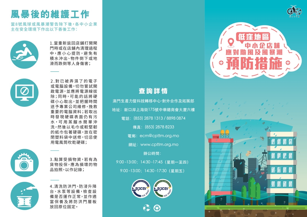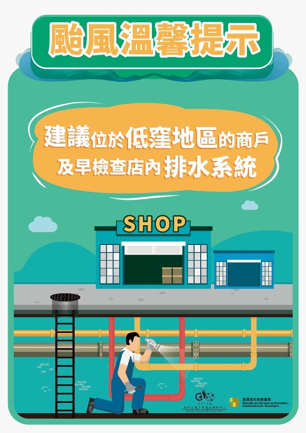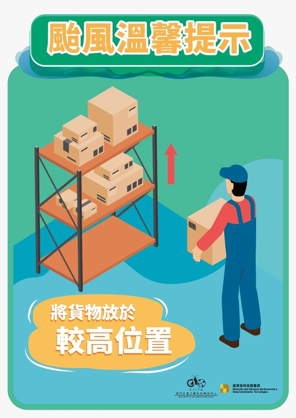 经济及科技发展局和澳门生产力暨科技转移中心提醒企业,特别位处低洼地区的商户,应做好防风防洪防浸的准备工作及预防措施,以免造成货物及设备损失。同时,商户应密切留意气象局发布的最新天气情况。