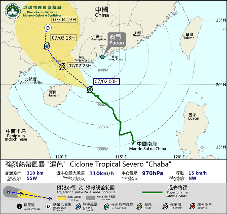 八号东南风球现正生效。强烈热带风暴「暹芭」预料将进一步增强为台风,并向西北方向移动,大致趋向广东西部。预计「暹芭」于清晨最接近本澳。