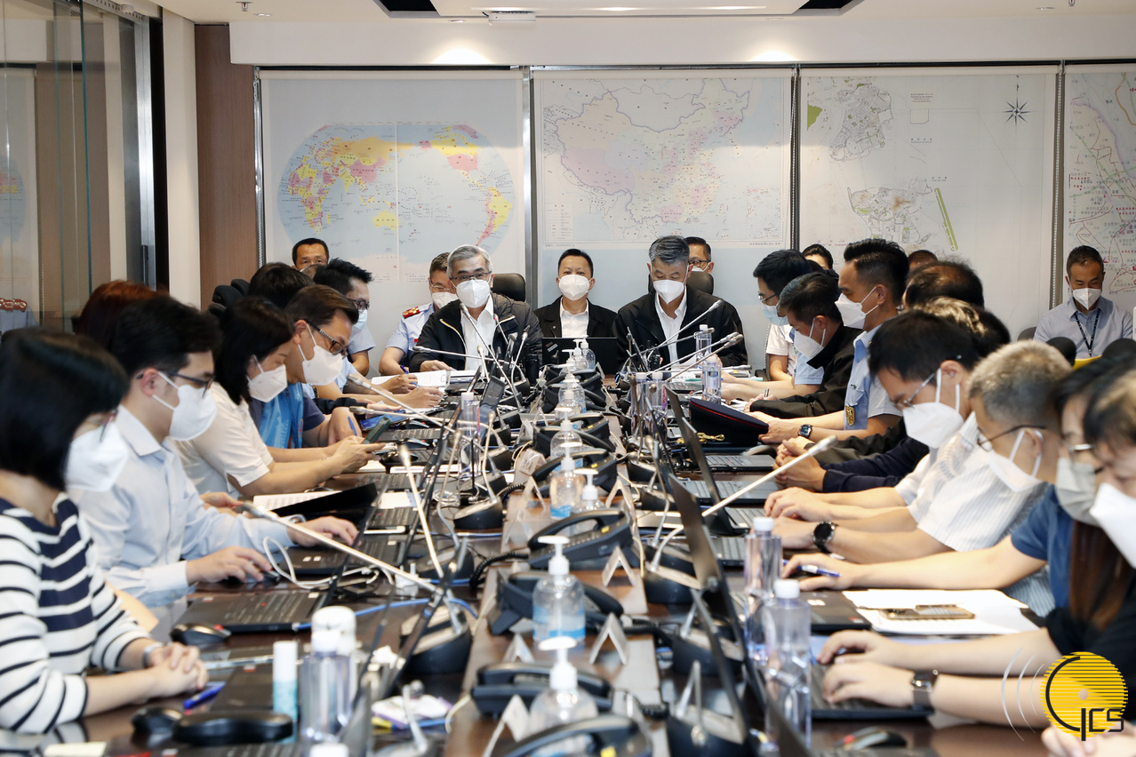 黄少泽在警察总局局长、辅助联合行动指挥官梁文昌、海关关长黄文忠等陪同下,与民防架构成员部门举行工作会议,听取部门成员汇报应对强烈热带风暴“暹芭”的工作部署。