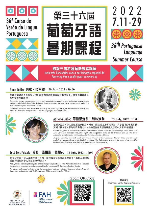 线上公开讲座向大众免费开放,葡萄牙语作家José Luís Peixoto、Nuno Júdice和Adriana Lisboa将分别以《21世纪首批葡萄牙小说家》(7月11日,19:00)、《诗歌是什么》(7月20日,19:00)及《文学与自然界》(7月29日,19:30)为题演讲。有兴趣人士届时可登入以下网址参加:https://umac.zoom.us/j/93170073369?pwd=ZlRwcjcraDBLQzA4UUtjYzliSzUxQT09.,与作家直接互动和对话,加深对葡语文学和文化的瞭解。