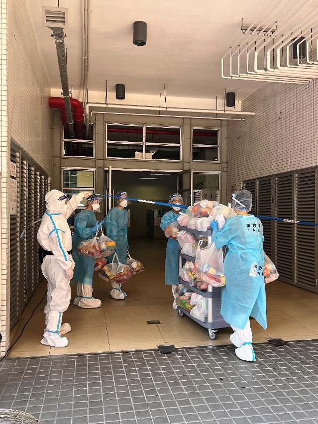 由法院系统不同工作岗位人员组成的维生支援队向红码大厦居民配送蔬菜冻肉包