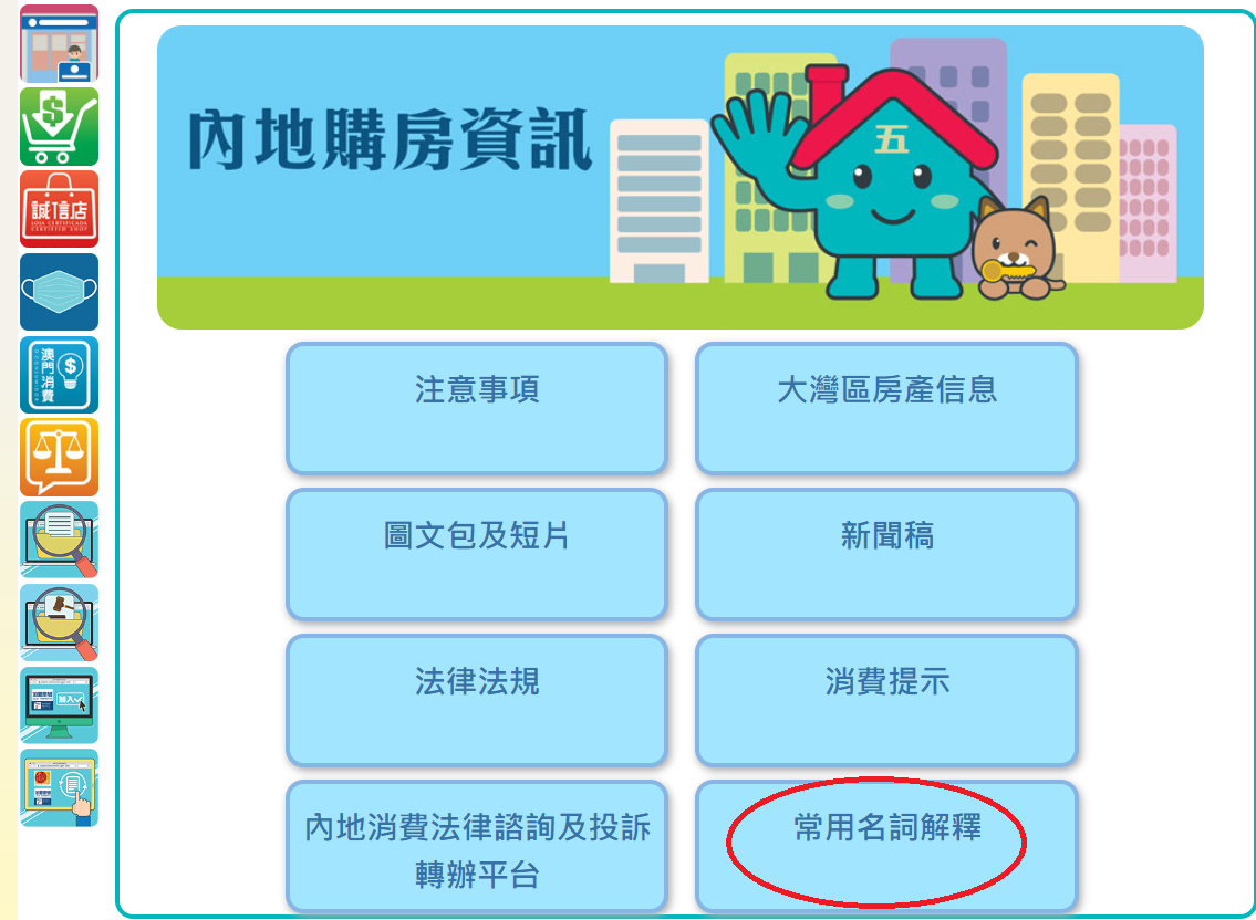 消费者委员会的“内地购房资讯”专页,新增内地房地产销售的“常用名词解释”专区,专区内的名词由广东省消费者委员会协助提供,相关解释具有一定的专业性,建议有意在内地购房人士善用专页内的各种资讯,提高维权意识。