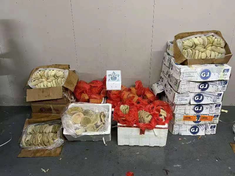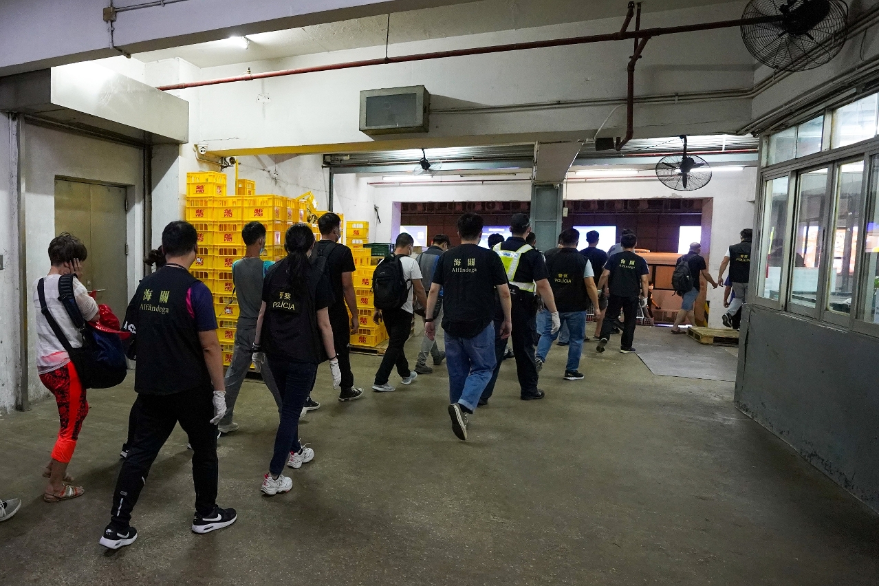 于8月9日傍晚,海关与治安警察局人员突击巡查位于北区一工业大厦,期间发现该工厦内一单位怀疑从事水客活动。双方人员见时机成熟,即时采取行动进入目标单位,当场截获16名怀疑进行水客活动人士,缉获急冻食材(牛柏叶)约500公斤,估值约11万澳门元。为减低新冠病毒的传播风险,海关执行防疫指引,对涉案货物进行消毒。经调查,显示有关急冻食材于本澳市场购买,购买后存于该单位内并利用水客偷运离澳。