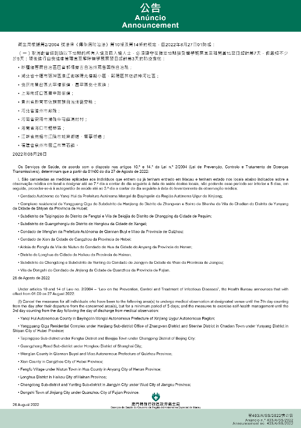 新型冠状病毒感染应变协调中心(下称应变协调中心)宣布,因应内地的疫情变化,卫生局根据第2/2004号法律《传染病防治法》第10条和第14条的规定,自2022年8月27日凌晨1时起,新增或取消对曾到内地相关区域人士的防疫措施: