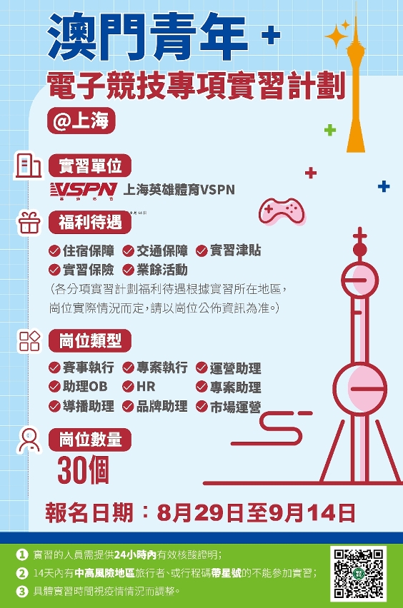 为培养澳门未来新产业所需人才,拓宽青年就业发展空间,劳工事务局与横琴粤澳深度合作区民生事务局(下称“横琴民生局”)推出「澳门青年电子竞技专项实习计划」,提供电子竞技、直播运营、行政管理相关领域实习岗位30个,8月29日至9月14日接受申请。