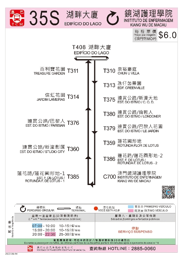 为便利高校师生出行,交通事务局经检视出行需求和巴士运作情况,由9月14日(周三)首班车起,新增35特班车(35S)、恢复71特班车(71S)营运及调整73特班车(73S)行程,详见附表;同时,“仁德大马路/护理学院”站会更名为“澳门镜湖护理学院”站,继续供25B及新增的35特班车(35S)乘客使用。局方会密切留意有关路线的运作情况,适时调整安排。