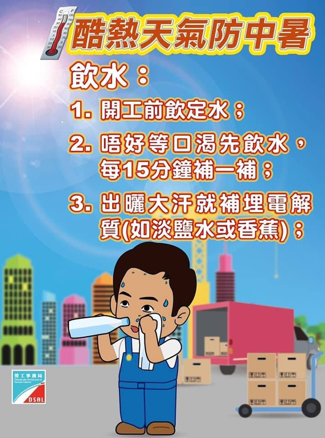劳工局呼吁工友做好预防中暑措施。包括: