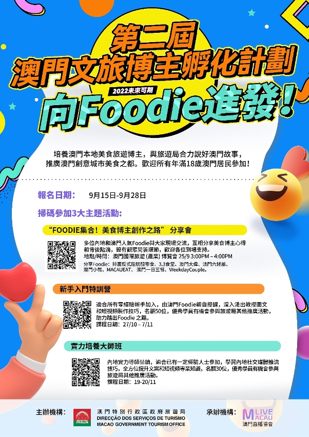 此外,9月25日在 “澳门国际旅游 (产业) 博览会” 举办期间,主办单位将于当日下午3时举行“FOODIE集合!美食博主创作之路”分享会,邀请内地及澳门人气美食网红出席,欢迎有兴趣人士可扫描活动宣传海报二维码报名参与。名额有限,额满即止。