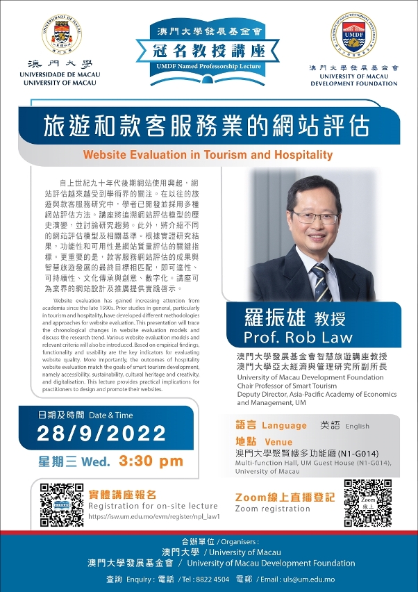 澳门大学将于9月28日(星期三)举办“澳门大学发展基金会冠名教授讲座”,由澳大发展基金会智慧旅游讲座教授罗振雄以“旅游和款客服务业的网站评估”为题发表演说,探讨不同的网站评估模型及与智慧旅游发展的关系。