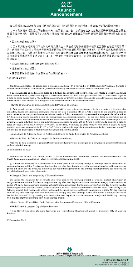 新型冠状病毒感染应变协调中心(下称应变协调中心)宣布,因应内地的疫情变化,卫生局根据第2/2004号法律《传染病防治法》第10条和第14条的规定,自2022年9月26日凌晨1时起,新增或取消对曾到内地相关区域人士的防疫措施: