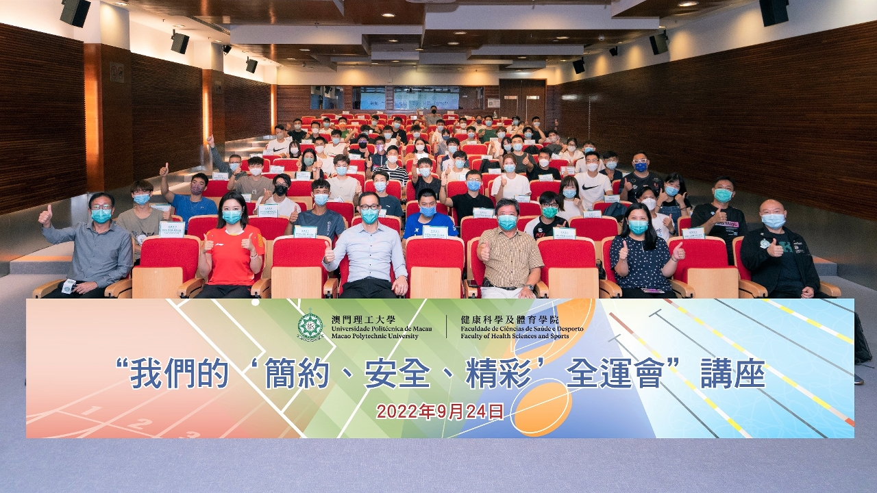 为迎接广东、香港、澳门承办的2025年第十五届全国运动会,澳门理工大学健康科学及体育学院于9月24日举办“我们的‘简约、安全、精彩’全运会”讲座,由华南师范大学体育科学学院教授谭建湘、澳门理工大学副教授区志权和实习讲师于小含主讲,以专家、教练、运动员的身份,鼓励大学生和青年积极参与大型体育赛事,全情投入全国运动会。