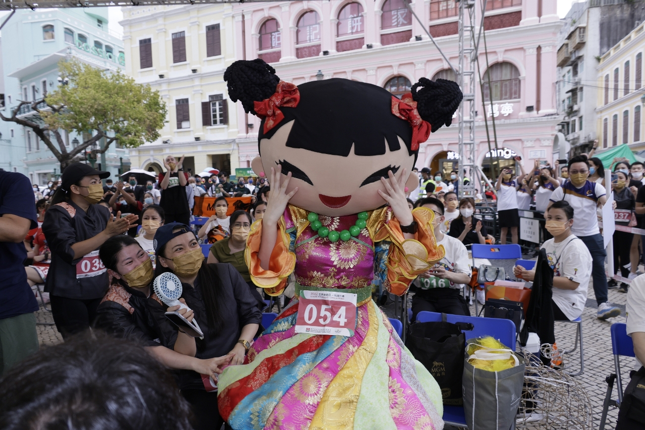 起步枪响起,特别嘉宾参赛者--澳门旅游吉祥物“麦麦"穿着汉服打扮,连同一众参赛者,手持载有一瓶“澳门啤酒"的托盘从大三巴牌坊出发,穿梭“澳门历史城区"街道,尽全力以最快速度将啤酒安全送达终点站议事亭前地,气氛紧张刺激,吸引沿途游人驻足观看。