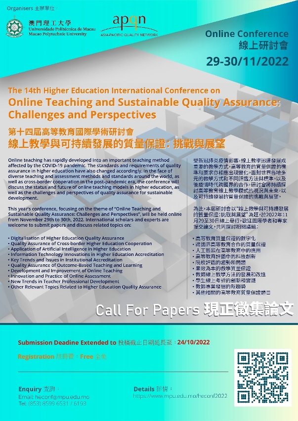 澳门理工大学与亚太地区教育质量保障组织(APQN)举办“第十四届高等教育国际学术研讨会——线上教学与可持续发展的质量保证:挑战与展望”于10月24日截止征稿,诚邀澳门及世界各地高等教育专家学者共同参与及发表相关领域的论文。研讨会旨在为持续提升高等教育的教与学质量水平,加强澳门与海内外高等教育机构的合作,探讨在后疫情时代高等教育线上教学和质量保证可持续发展的挑战与展望。