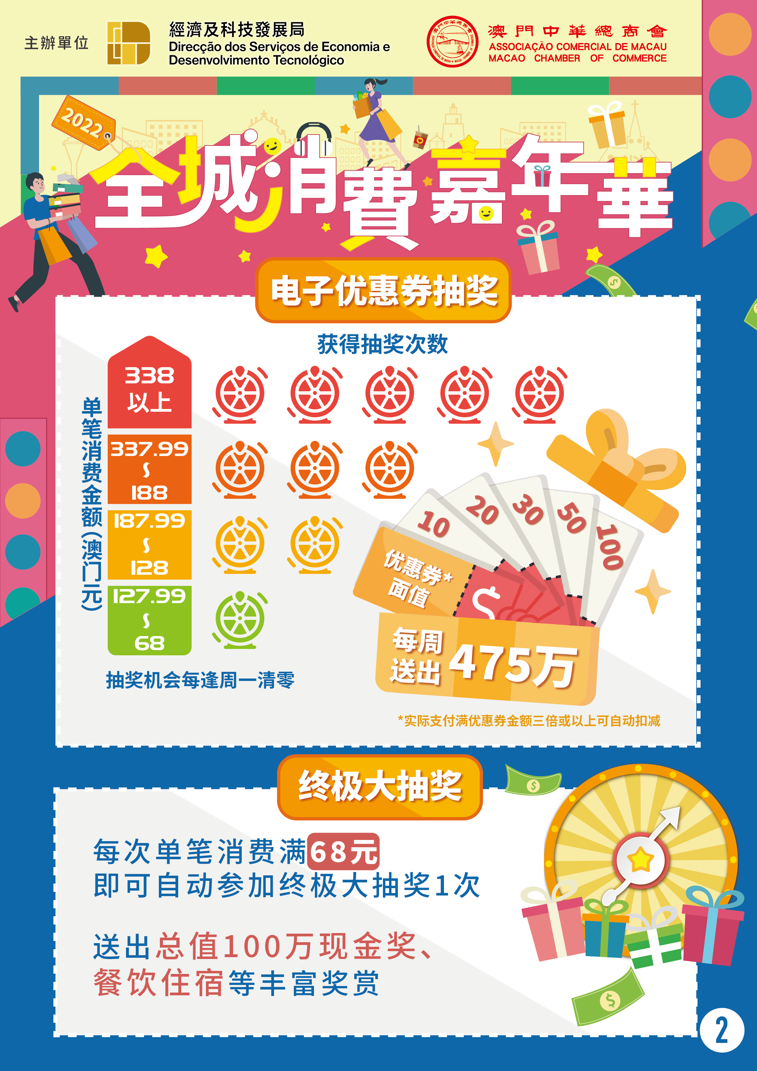 “2022年全城消费嘉年华"将于10月15日正式推出,直至明(2023)年2月28日,活动为期长达20周。活动奖金奖品总值近1亿澳门元,活动期间,通过实名认证的电子钱包用户于全澳线下大部分实体店铺消费时,透过移动支付单笔实付满68元(澳门元,下同),即可获得抽奖机会获取电子优惠券,更可于活动结束后参加终极大抽奖。终极大抽奖奖品丰富,包括总值高达100万元现金、餐饮住宿等。