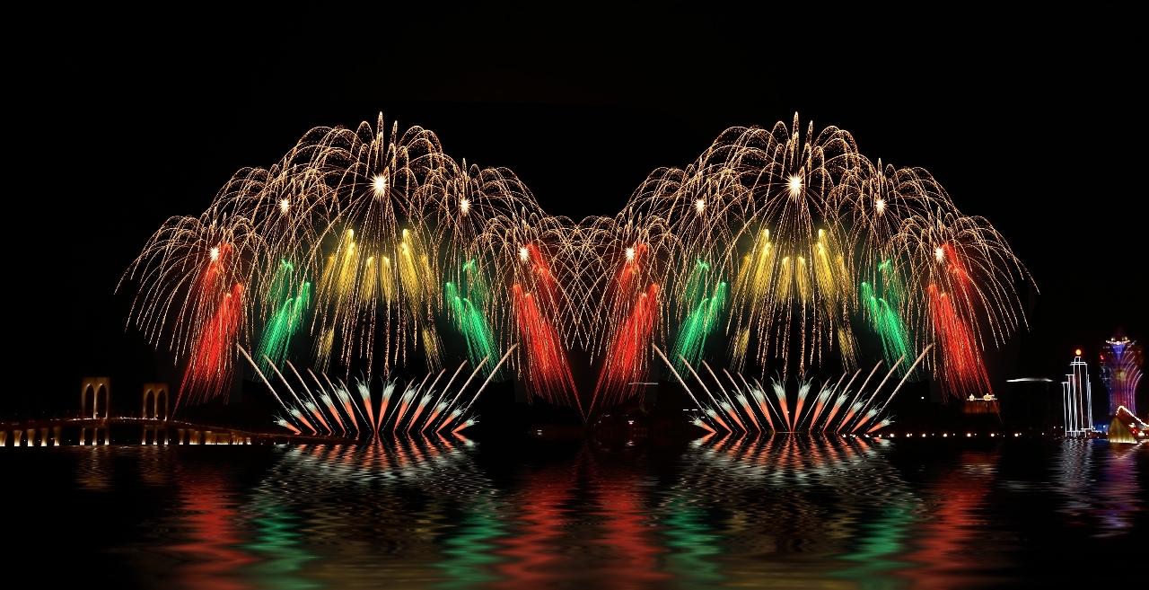 第二篇章“鎏金岁月”以银色为主要色调的烟花闪亮夜空,翻开岁月的雕琢,展现澳门古朴与华丽的城市面貌。