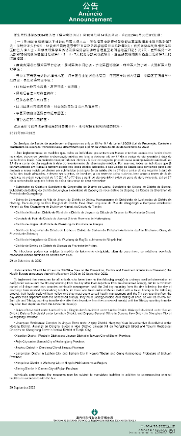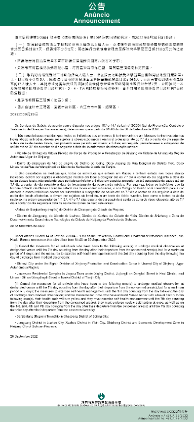 新型冠状病毒感染应变协调中心(下称应变协调中心)宣布,因应内地的疫情变化,卫生局根据第2/2004号法律《传染病防治法》第10条和第14条的规定,自2022年9月30日凌晨1时起,新增或取消对曾到内地相关区域人士的防疫措施: