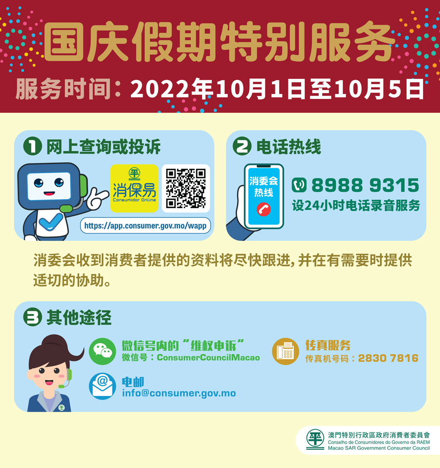 配合“十・一”国庆假期,消费者委员会由10月1日(周六)至5日(周三)设假期特别服务受理消费者的查询及投诉。