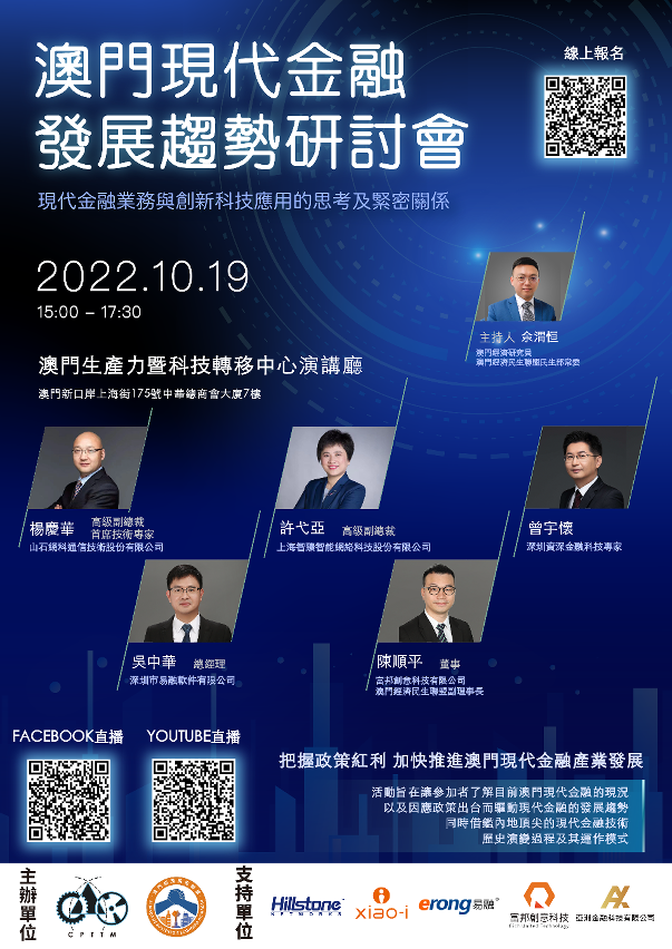 由澳门生产力暨科技转移中心与澳门经济民生联盟合办的“澳门现代金融发展趋势研讨会”将于10月19日在该中心举行,欢迎本澳金融业从业员或有兴趣人士报名参加,费用全免,名额有限,先到先得。