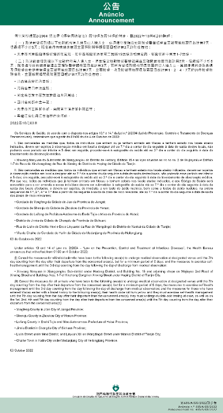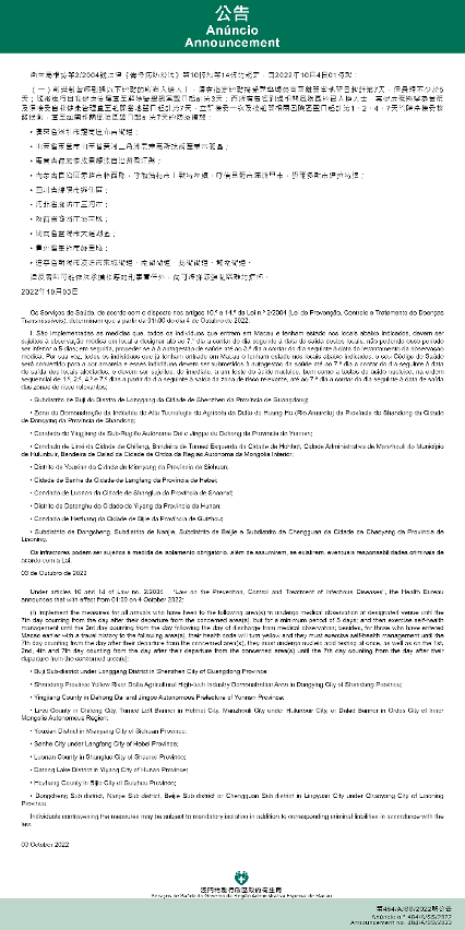 新型冠状病毒感染应变协调中心(下称应变协调中心)宣布,因应内地的疫情变化,卫生局根据第2/2004号法律《传染病防治法》第10条和第14条的规定,自2022年10月4日凌晨1时起,新增或取消对曾到内地相关区域人士的防疫措施: