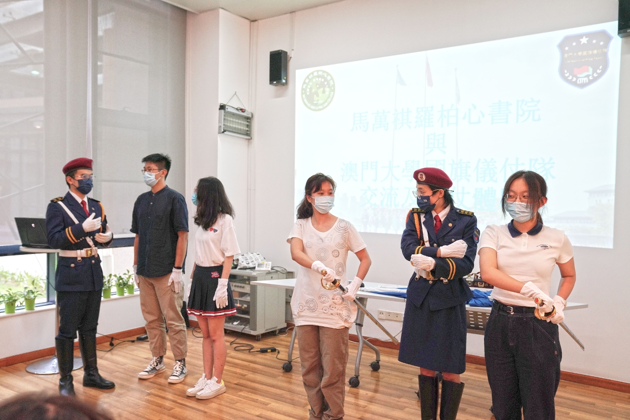 “走进书院”系列活动通过国旗文化知识讲座、队伍介绍等多种方式向书院院生宣传国家安全的观念,助力爱国爱澳精神及国旗文化的传承与发扬,为澳大培养更多爱国爱澳人才贡献力量。在交流活动中,旗队队员介绍了国旗、仪仗指挥刀等重要仪仗用具,并特别加入擎旗、持指挥刀的体验环节,使院生们切身体会到“国家之象征”在肩、“国威之代表”在手带来的责任感及使命感。众多院生表示,活动让他们不仅领略到国旗仪仗队的精神风采,也瞭解到许多的国旗知识文化,受益匪浅。