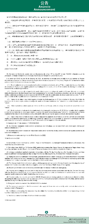 新型冠状病毒感染应变协调中心公布,卫生局根据第2/2004号法律《传染病防治法》第10条及第14条的规定,调整第352/A/SS/2022号公告中由外国、香港特别行政区、台湾地区入境人士健康管理措施,自2022年10月15日起,取消在解除医学观察翌日起计第4至7天健康监测及在解除医学观察翌日起计第5、7天接受新型冠状病毒核酸检测的措施,但入境人士须在解除医学观察当天起连续4天进行自我健康管理及每天到社区核酸站接受核酸检测。