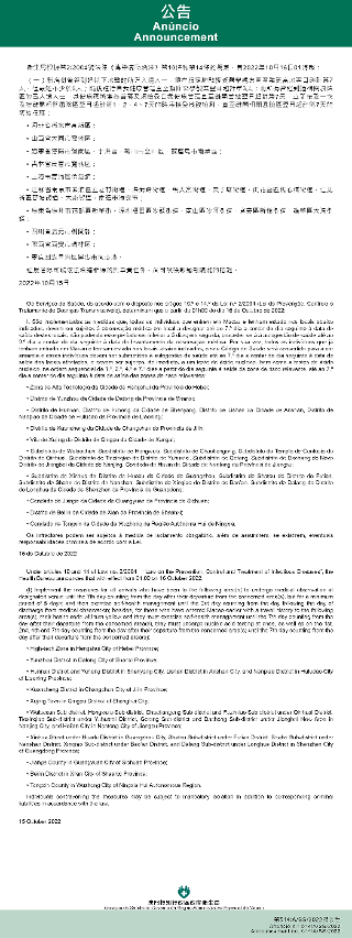 新型冠状病毒感染应变协调中心(下称应变协调中心)宣布,因应内地的疫情变化,卫生局根据第2/2004号法律《传染病防治法》第10条和第14条的规定,自2022年10月16日凌晨1时起,新增或取消对曾到内地相关区域人士的防疫措施: