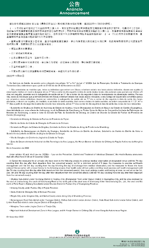 新型冠状病毒感染应变协调中心(下称应变协调中心)宣布,因应内地的疫情变化,卫生局根据第2/2004号法律《传染病防治法》第10条和第14条的规定,自2022年11月5日凌晨1时起,新增或取消对曾到内地相关区域人士的防疫措施:
