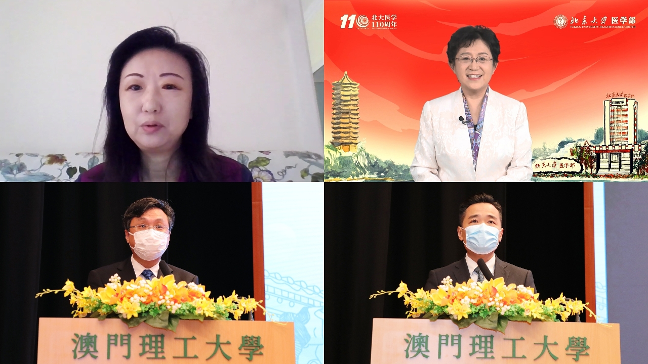 • 国家卫健委港澳台办副主任李维(左上)、北京大学常务副校长与医学部主任乔杰、澳门理工大学校长严肇基及澳门特区政府卫生局局长罗奕龙在开幕式上致词