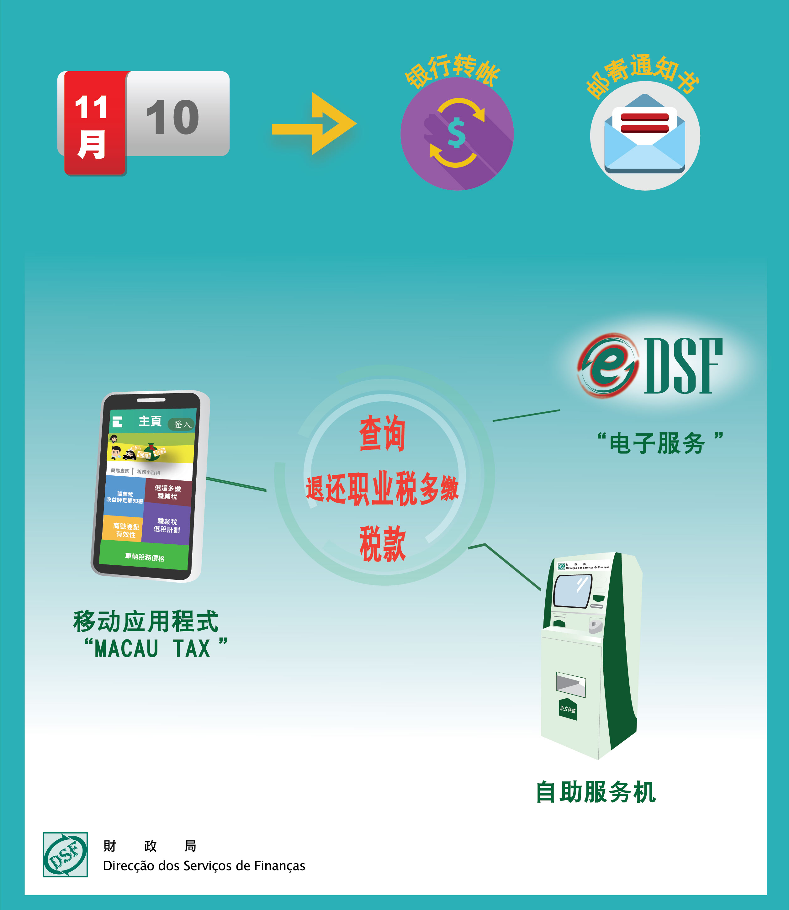 关于职业税纳税人已缴之2021年度职业税,财政局开始退回在该年多缴税款,涉及约六万零四百名纳税人。于11月10日,约四万两千有2021年度职业税退税的纳税人透过银行转帐收退税款,占总退税人数百分之七十;其余未登记银行转帐的纳税人,随后将收到挂号邮寄之「职业税退税通知书」领取退税款,当中经公司收退税及由其本人收退税款者,分别占总退税人数百分之十二及百分之十八。