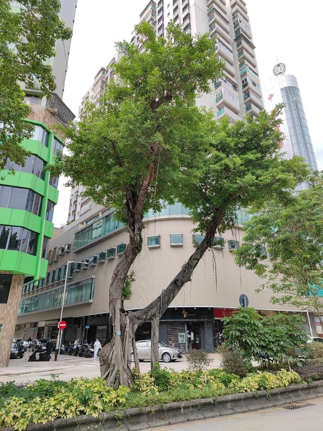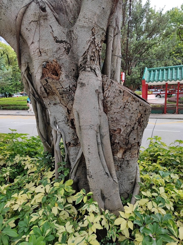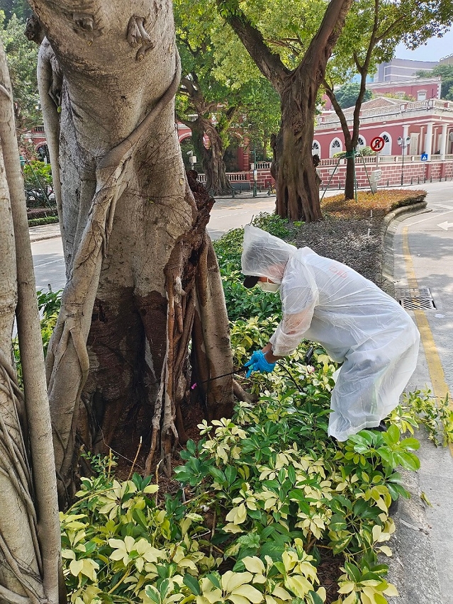 市政署树木养护人员于最近的恒常巡查中,发现南湾大马路中央绿化带一株榕树,主干基部表面再出现蛀干虫孔、局部树皮干裂和坏死,现正加紧施药救治及护理。
