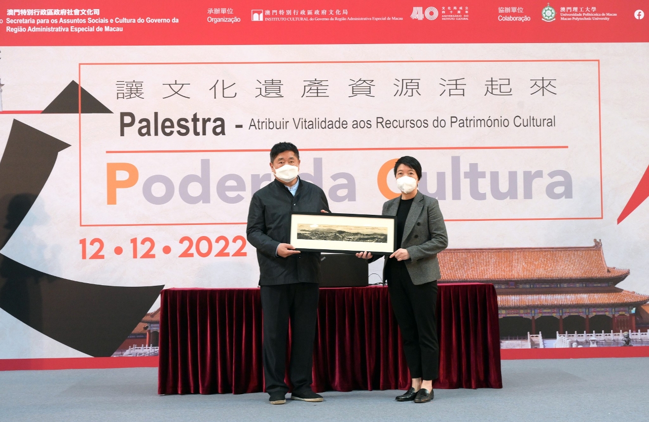 由澳门特别行政区政府社会文化司主办、文化局承办、澳门理工大学协办的“文化的力量——让文化遗产资源活起来”讲座,今日(12月12日)在澳门理工大学体育馆举行,讲座由故宫博物院原院长单霁翔博士讲解故宫文物及其与现实生活的联系,探讨以创新形式把文化遗产资源融入生活,资料珍贵丰富,讲解活泼生动,深获听众好评,讲座为本澳文化遗产的保护与传承、与文化创意的融合与利用带来启发。