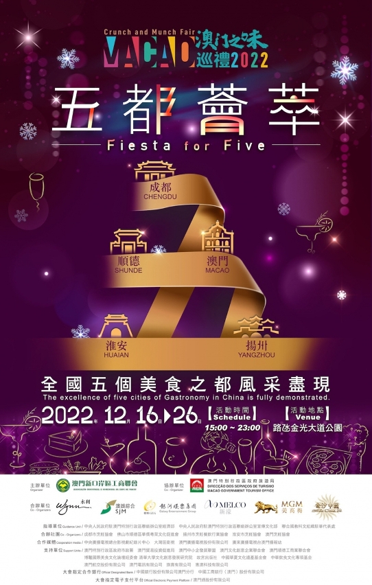 崭新美食活动“澳门之味巡礼——五都荟萃”将于今(16日)晚上7时假路氹金光大道公园开锣,一连11天精彩呈献成都、顺德、澳门、扬州及淮安五个“创意城市美食之都”的特色美食,藉此深化“旅游+美食”联动融合,提高澳门作为旅游城市的吸引力,全力扩大客源。