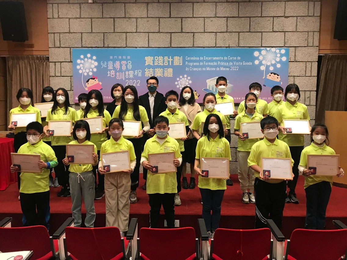 由文化局主办、澳门文化遗产协会承办的“2022年澳门博物馆儿童导赏员实践计划”于日前(12月18日)在澳门博物馆举行结业礼,由文化局文博厅厅长沈浩然、澳门博物馆馆长卢可茵、澳门文化遗产协会方静雯副会长、课程导师黎彩玉出席主持颁奬仪式。