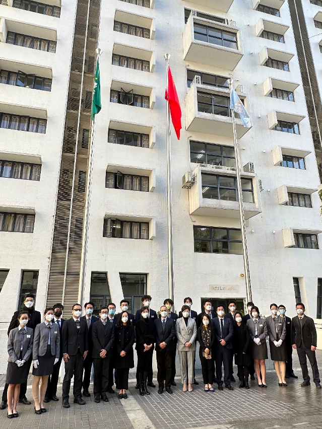 2022年12月20日,澳门旅游学院为庆祝澳门回归祖国二十三周年,于氹仔校区举行升国旗仪式,学院领导、部门主管、学生和员工出席。中华人民共和国国旗、澳门特别行政区区旗与学院校旗在激昂的国歌声中冉冉升起,随风飘扬。