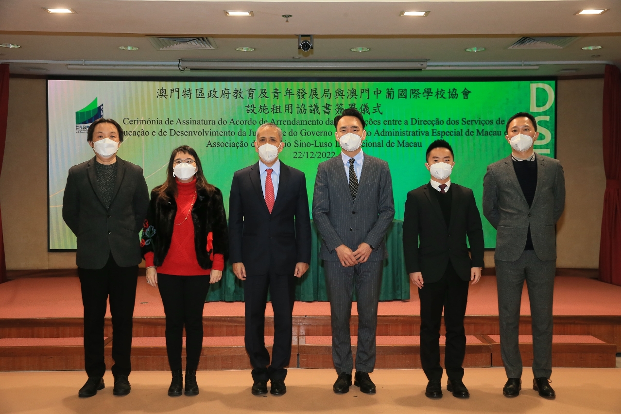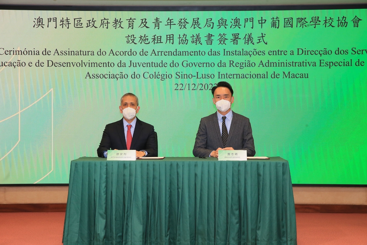 根据第100/2022 号社会文化司司长批示授予之权力, 2022年12月22日,澳门中葡国际学校协会设施租用协议书的签署仪式在教育及青年发展局举行,由教青局局长龚志明代表特区政府与澳门中葡国际学校协会代表欧安利签署相关协议。