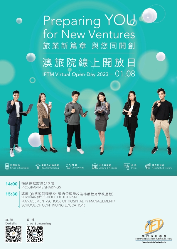 澳门旅游学院是本澳目前提供最多元化的文旅和款待管理学位课程的高等院校,教学水平享誉国际,于2022年QS世界大学学科排名榜中,学院在“款待及休闲管理”(Hospitality & Leisure Management)中排名澳门第1、亚洲第3及全球第23位。本周日下午二时启动的线上开放日,由酒店管理学校及旅游管理学校分别举行课程分享会,多位在读学生、教师将亲身讲解教学特色,畅谈课程点滴,并与观众实时互动,让参与的学生和家长充分了解各课程的教学内容、国际化师资、全英学习环境、丰富的社会参与以及课程实践机会等。各研究生课程也会派出师生分享学士后文凭、理学硕士和哲学博士学位的报考和攻读资讯。
