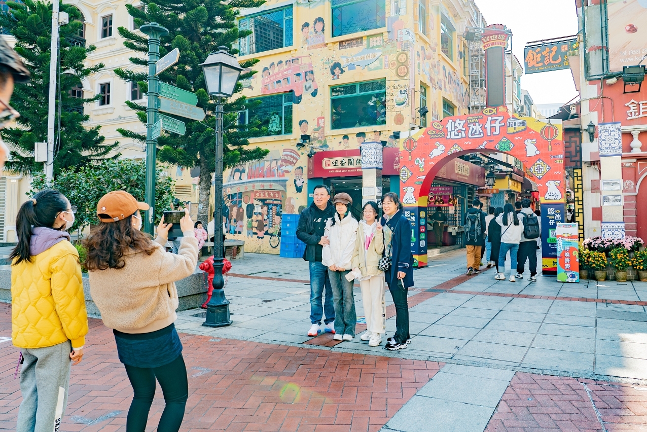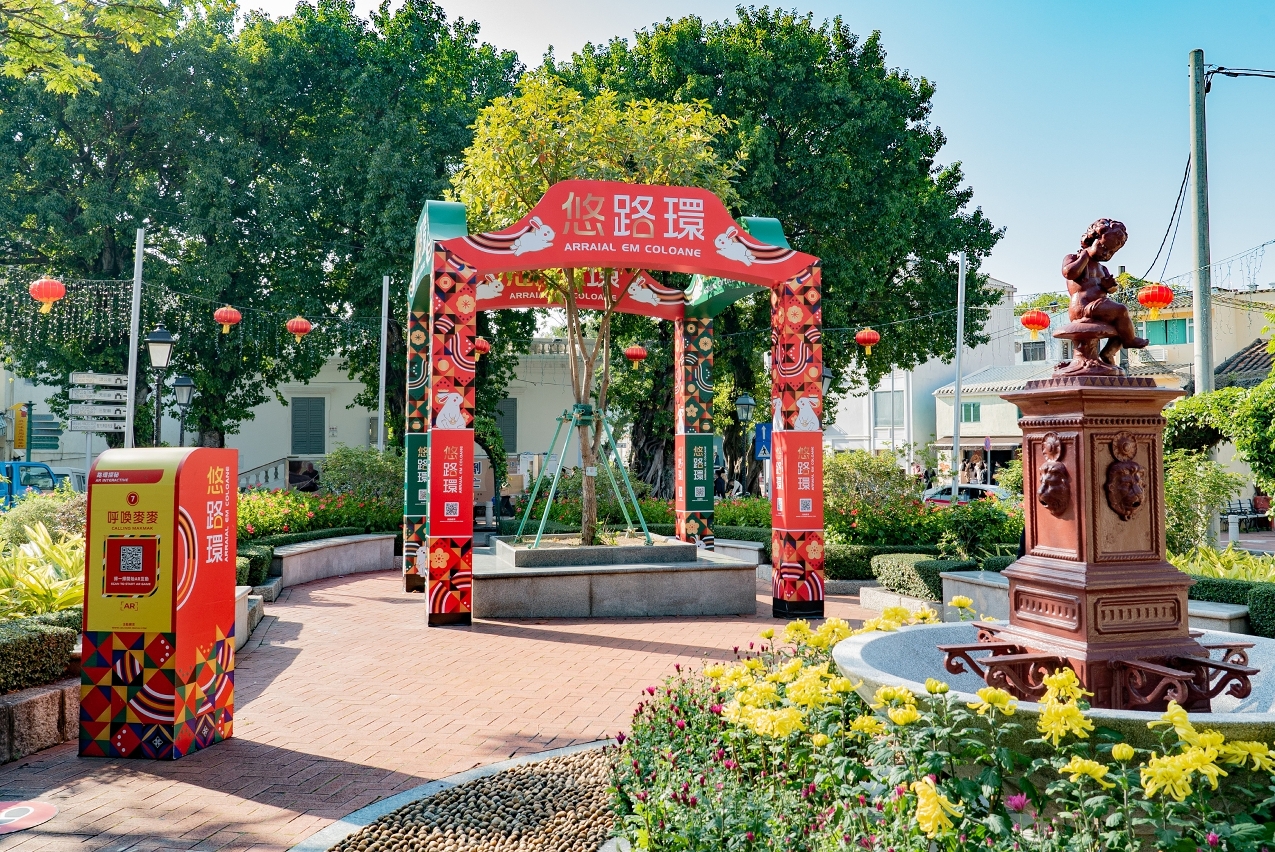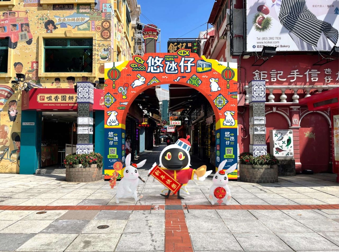 农历新年期间,“悠氹仔”、“悠路环”及“关前荟”三区的活动牌楼增添了兔年特色新春装饰,澳门旅游吉祥物麦麦亦换上贺年服饰与福兔一起在AR互动中向市民及旅客拜年。